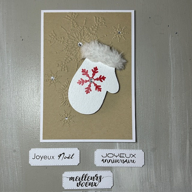Carte tout en douceur avec bonhomme en pain d'épice et des flocons en bois